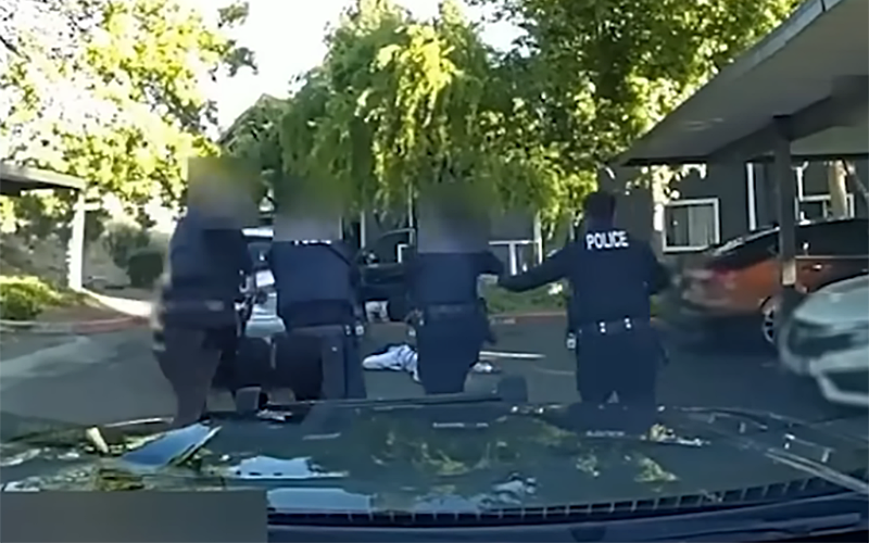 Vallejo police dashcam footage shows police officers approaching Alexander Schumann after shooting him. The officers’ identities are concealed, in violation of the public records law.
