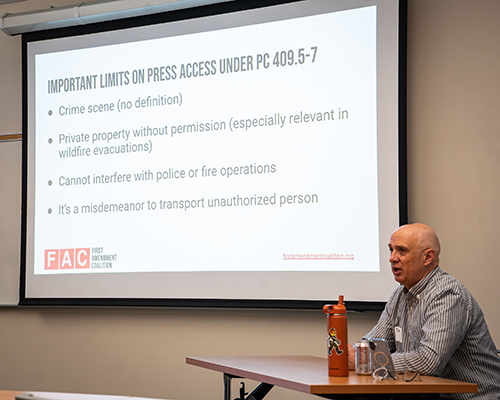 Coachella Valley journalists got a primer on media law topics from David during a working lunch presentation and Q&A. Discussion covered shield law protections, rules around recording in public and restricted areas, state laws providing press special rights of access to restricted locations and other media law topics. Many of these topics are addressed in the FAC legal team’s Explainers resource and Asked & Answered.